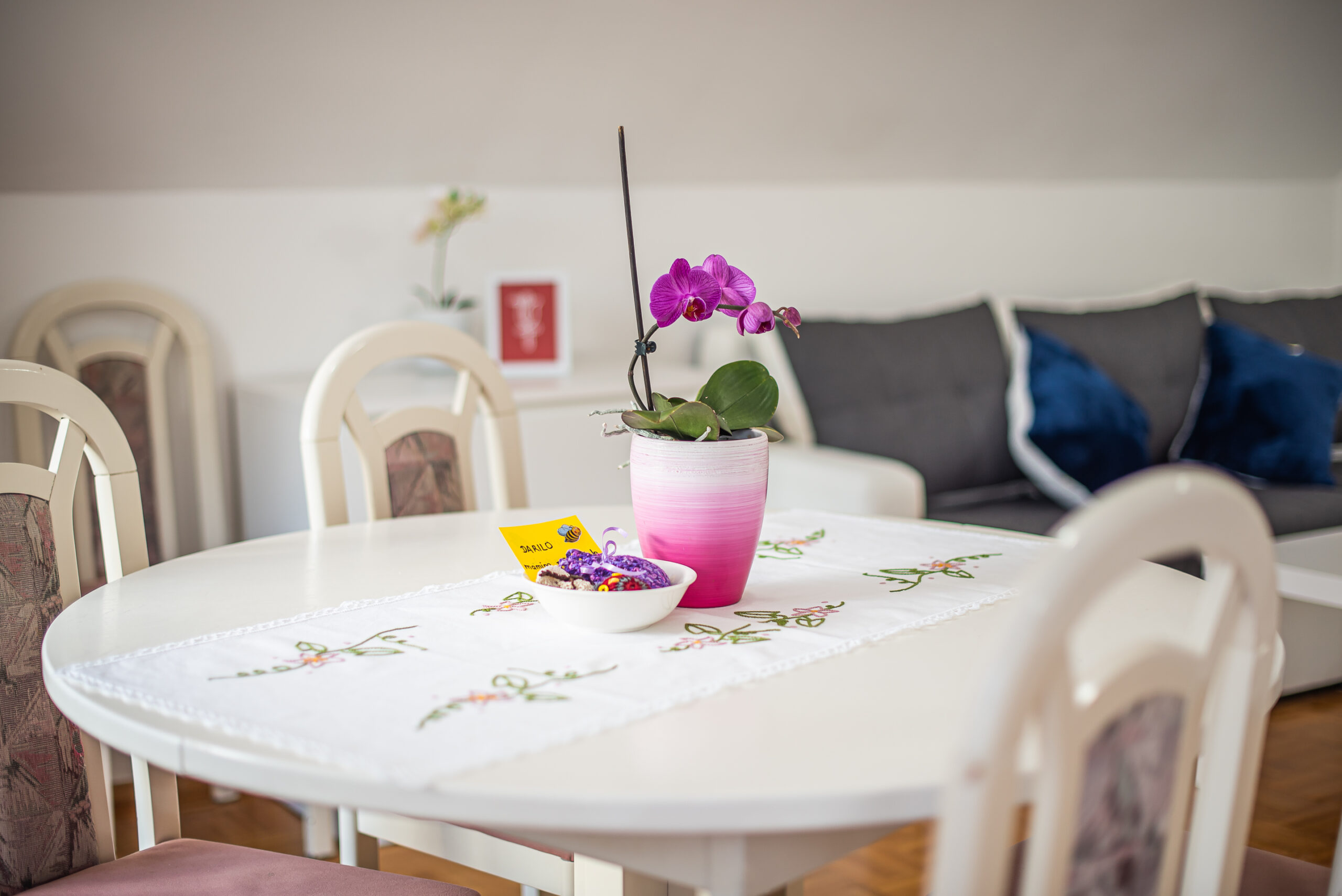 Apartma je velik 50 m2 in je primeren za 4 osebe. Spalnica z zakonsko posteljo se nahaja v mansardi in ima klimo, varnostni sef ter počivalni podest primeren za spanje, branje knjige ali le dnevno sanjarjenje. Na željo gosta nudimo tudi otroško posteljico. Kopalnica ima prostorno tuš kabino. Kuhinja je popolnoma opremljena in ima vso posodo, pomivalni stroj, mikrovalovno pečico, toaster, kavomat, grelnik vode in velik hladilnik z zamrzovalnikom. V dnevni sobi je sedežna garnitura, ki se raztegne v ležišče za 2 osebi. Apartma ima seveda tudi WI-FI in TV, a se vam zna zgoditi, da ju zaradi lepot in dogodivščin sploh ne boste potrebovali! Ob prihodu so na voljo posteljnina in brisače.