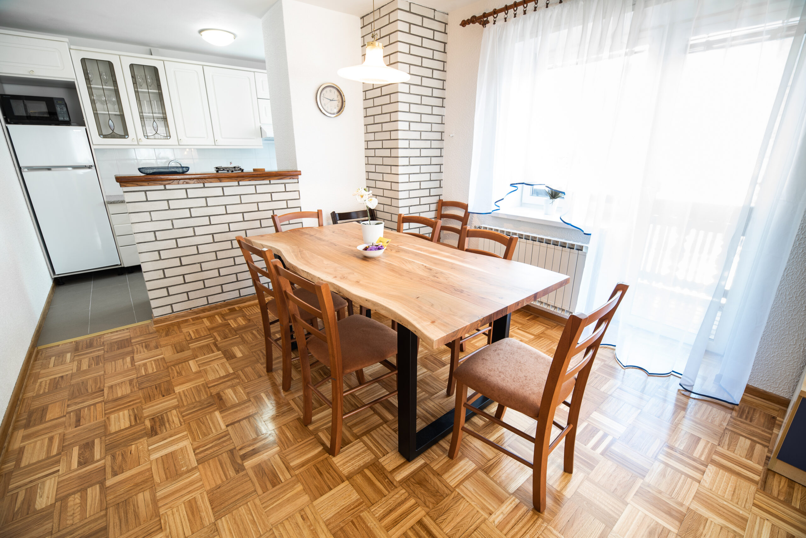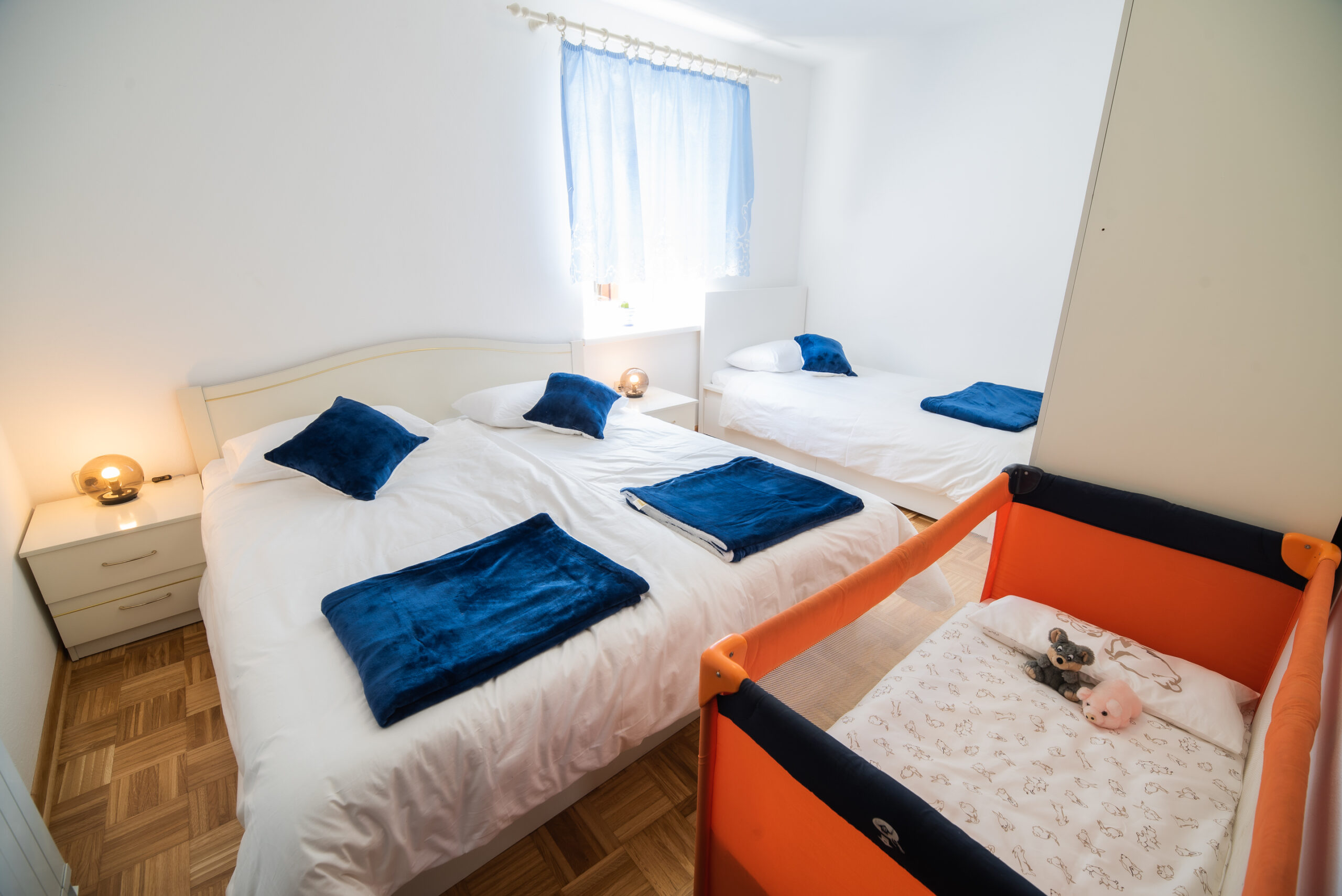 Velikost apartmaja je 74 m2 in je primeren za 7 oseb. Spalnici sta dve: prva ima tri ležišča, druga pa dve ležišči. Na željo gosta nudimo tudi otroško posteljico. Kopalnica je prostorna in ima kad. Kuhinja je popolnoma opremljena, z vso posodo, pomivalnim strojem, vgradno pečico in mikrovalovno pečico, toasterjem, kavomatom, grelnikom vode in velikim hladilnikom z zamrzovalnikom. V dnevni sobi je počivalnik in sedežna garnitura, ki se raztegne v dodatno ležišče. Apartma ima seveda tudi WI-FI in TV, a verjemite, da boste zaradi vseh dogodivščin in lepot nanju komaj pomislili. Ob prihodu so na voljo posteljnina in brisače.